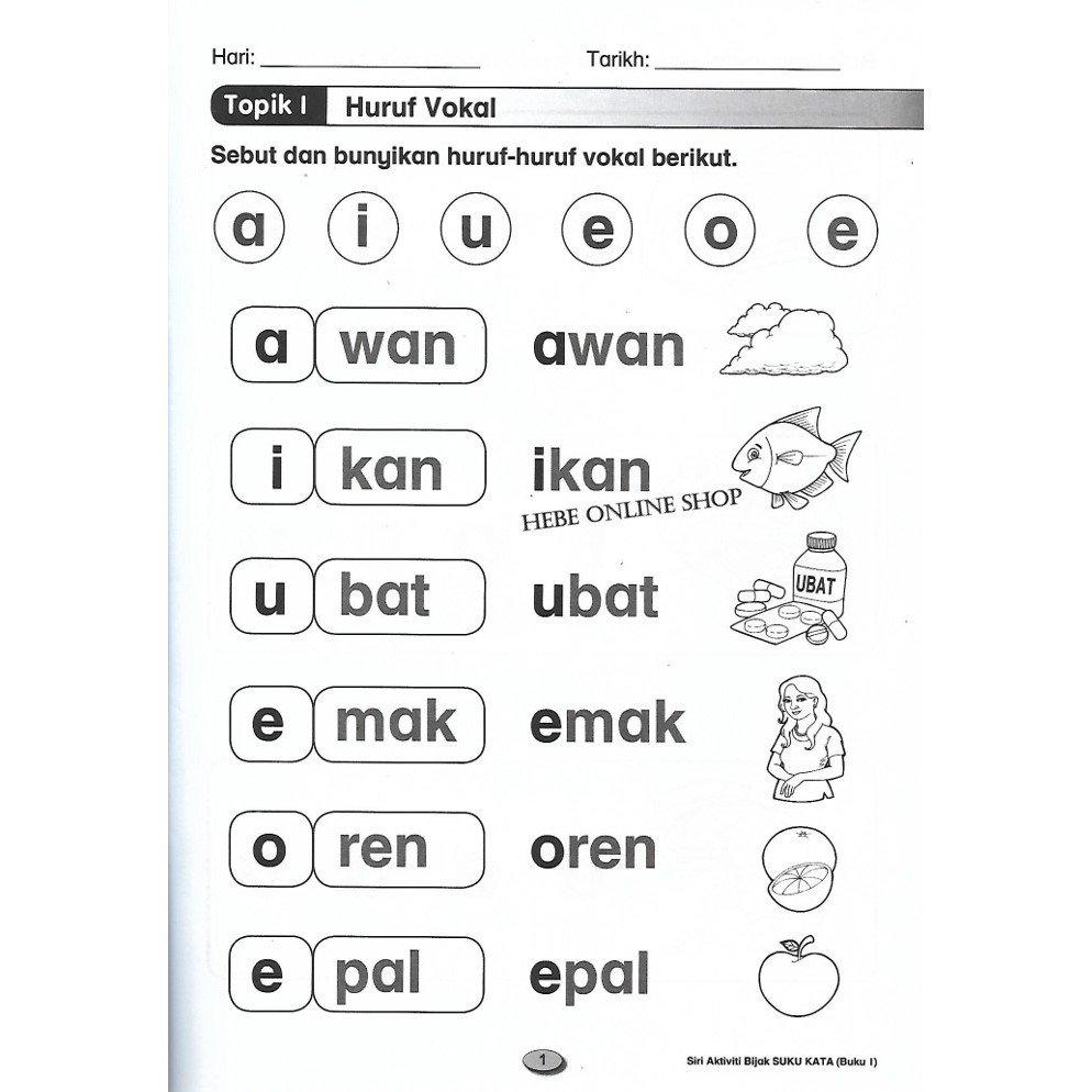 Latihan bahasa melayu huruf vokal dan sukukata kvk kvkv. Apakah kandungan lembaran latihan huruf vokal a, e,i,o dan u ini?
